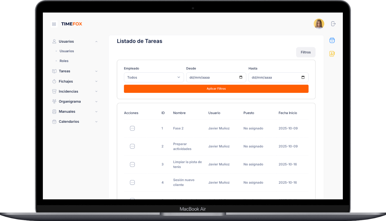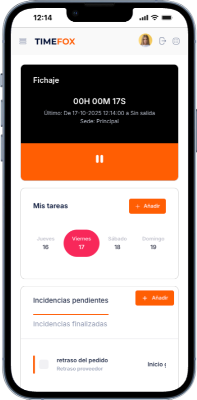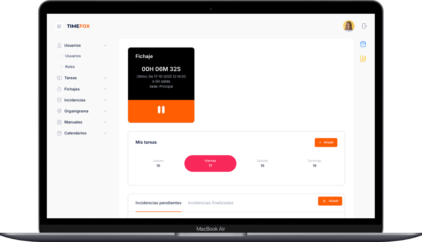 TimeFox es un software de control horario y sistema de fichaje para empresas, diseñado para cumplir la normativa laboral y optimizar la gestión del tiempo de trabajo.